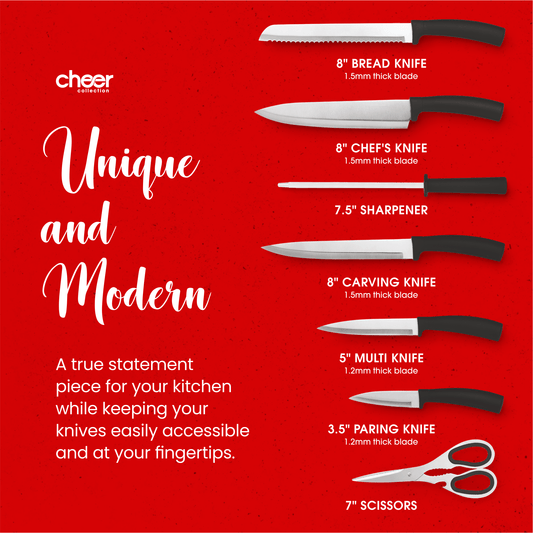 Cheer Collection Chef Knife Set (7 Piece) with Rotating Stand - Sharp Serrated and Standard Blades