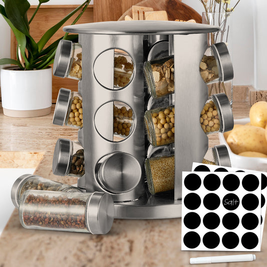 Cheer Collection Rotating Spice Rack for Countertop with 12 Jars, Stainless Steel Revolving Storage Organizer for Spices and Seasonings, plus Dry Erase Marker and 48 Reusable Labels