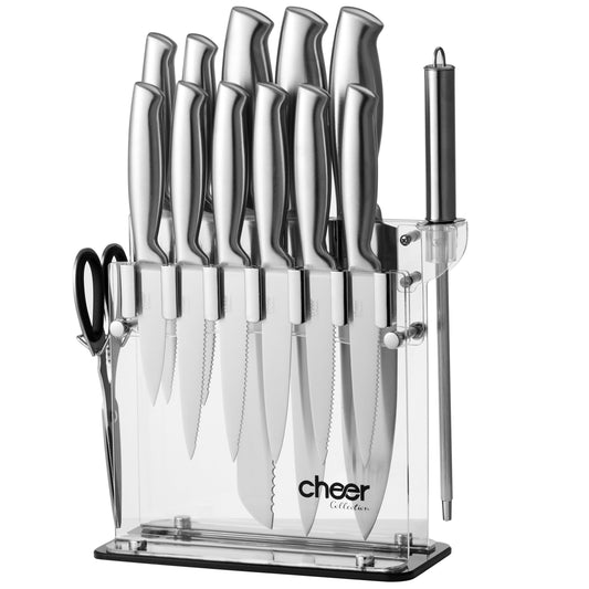 Cheer Collection Stainless Steel Chef Knife Set with Acrylic Stand (14-Piece) Professional Kitchen Utensils - Sharp Serrated and Standard Blades for Mincing, Chopping, Slicing