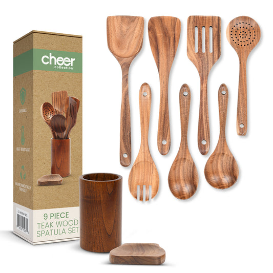 Cheer Collection 9 Piece Deluxe Wooden Utensils Set with Holder and Spoon Rest