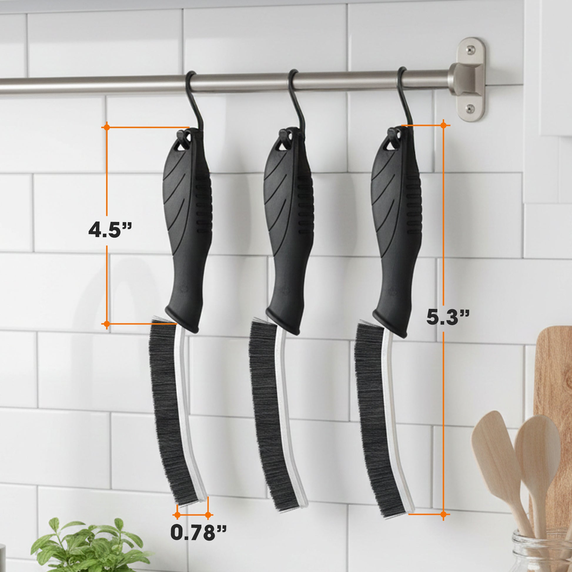 SET OF 3 FOR MULTI AREA USE: Includes three brushes so you can assign one for kitchen, bathroom, and utility areas. Ideal for drains, faucet gaps, window rails, and appliances. Hanging holes allow quick drying and storage. Always have one ready where you need it