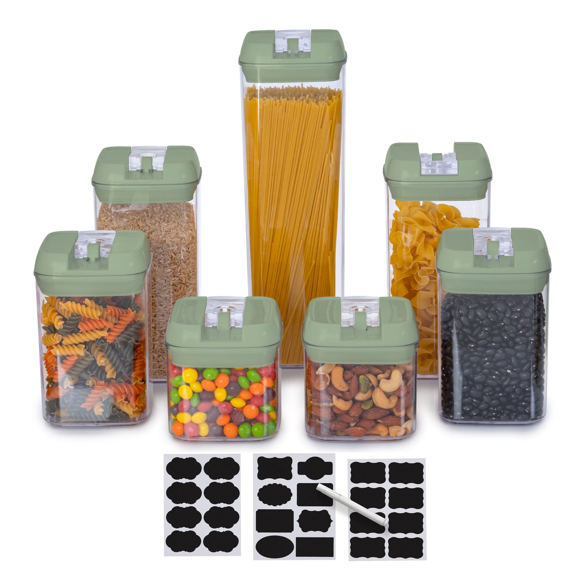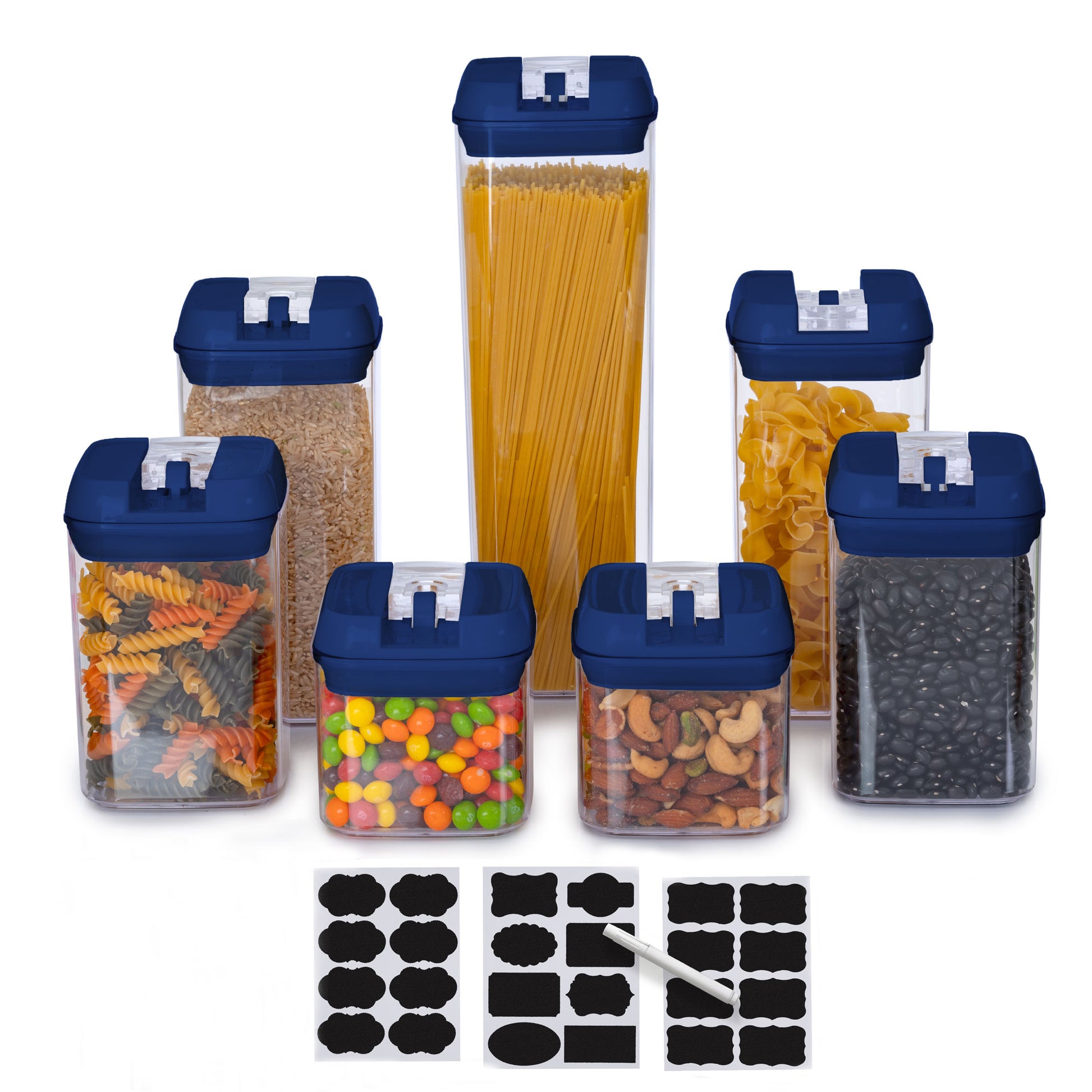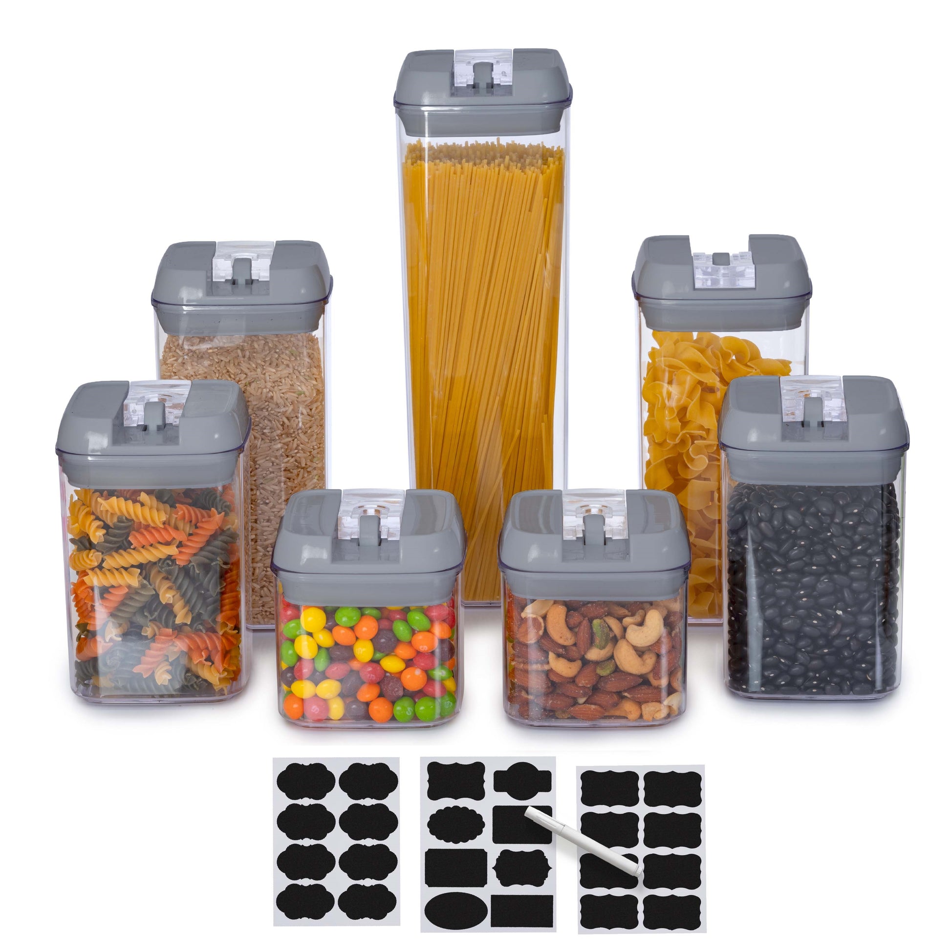- PANTRY ORGANIZATION - Airtight, space efficient stackable design keeps your pantry and kitchen cabinets organized; Set includes 7 wide mouth containers and lids plus white dry erase marker and 24 reusable labels