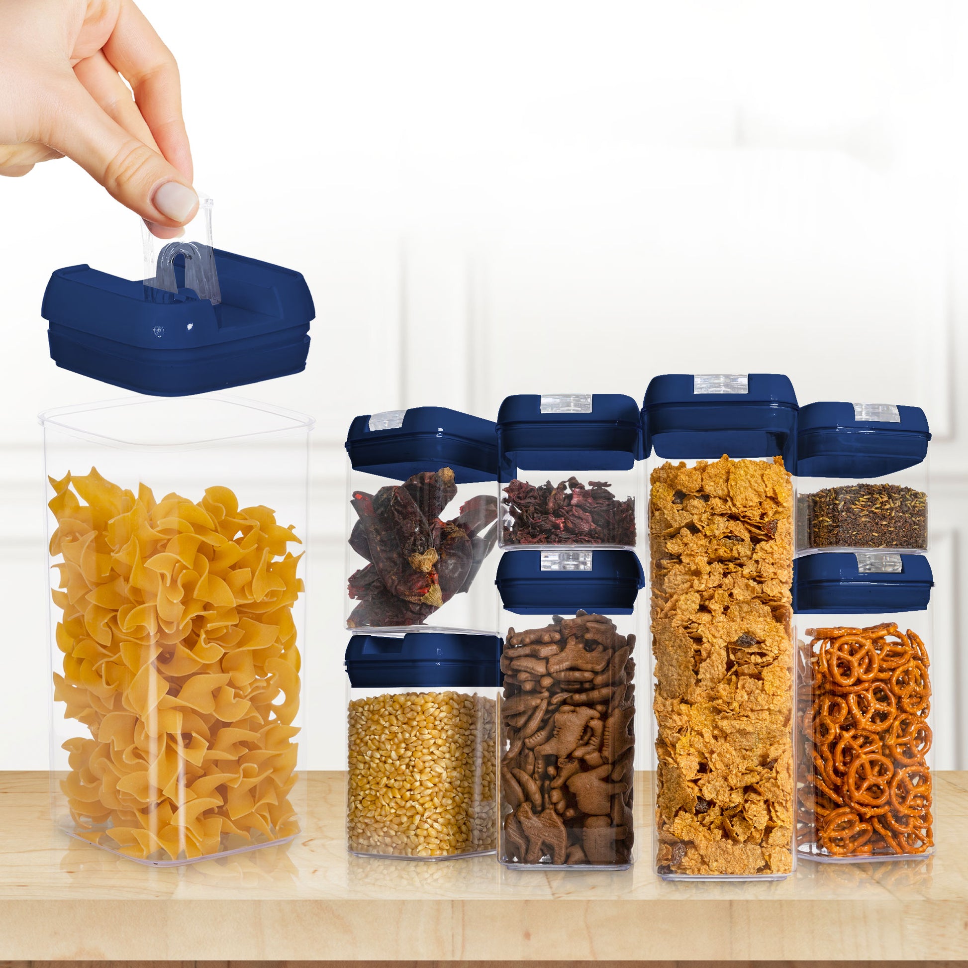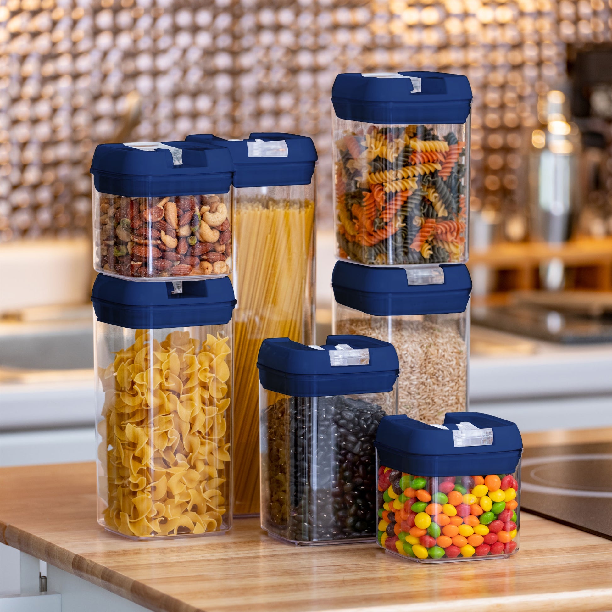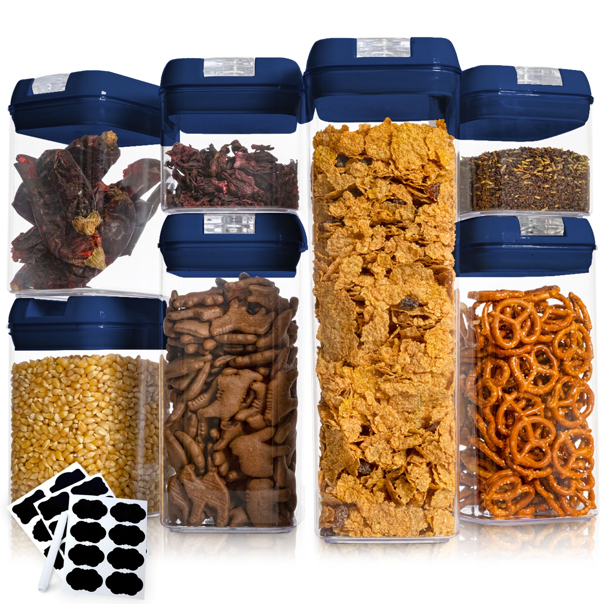 - PANTRY ORGANIZATION - Airtight, space efficient stackable design keeps your pantry and kitchen cabinets organized; Set includes 7 wide mouth containers and lids plus white dry erase marker and 24 reusable labels
